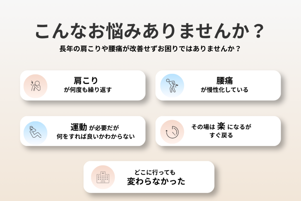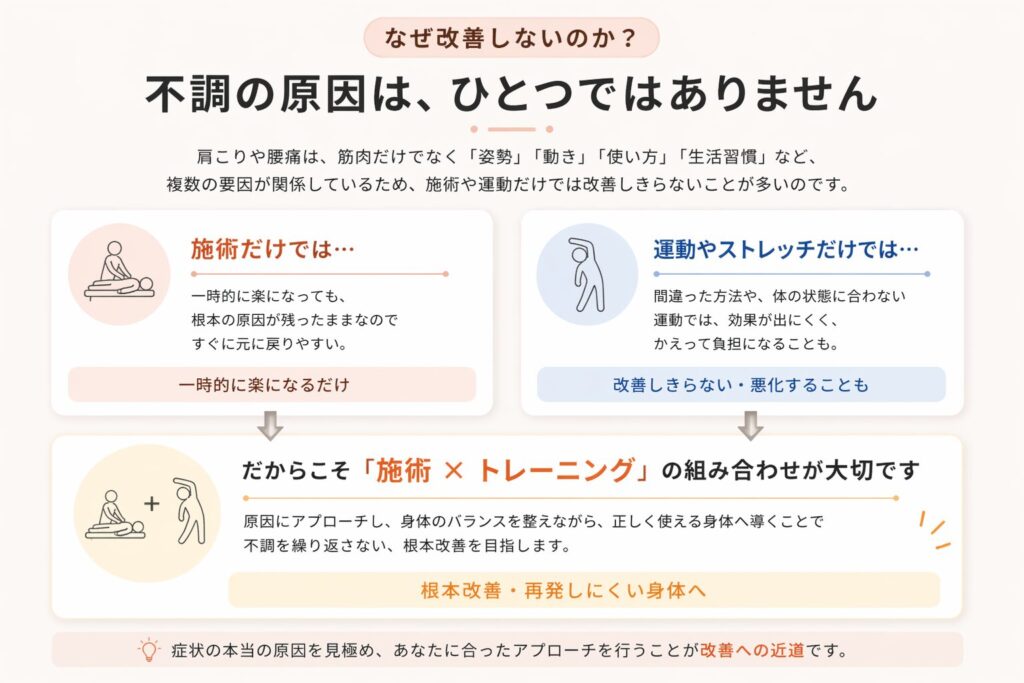 それぞれ違った痛み、悩みがあると思いますが共通していることは、「そのままにしている」「解決方法がわからない」ということではないでしょうか。実際に、「これまで何箇所か行ってみたもののなかなか良くならなかったから諦めていた。」と言った方や、「なんとなく動画を見て自分なりに体操とか運動をやってるけど続かないし良くもならない。」といったお話をよく耳にします。